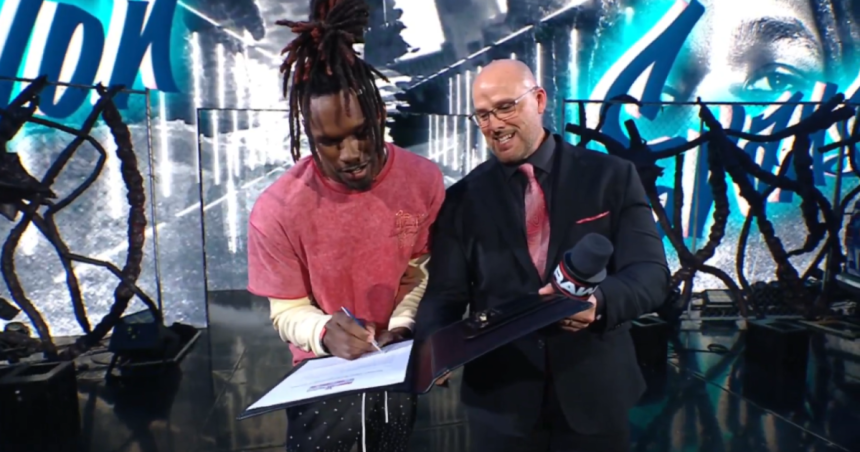 Lors d’une des pauses publicitaires de l’épisode de cette semaine de WWE RAW, le directeur général Adam Pearce est monté sur scène avec un contrat et a présenté une vidéo promotionnelle mettant en avant la star de NXT, Je’Von Evans.