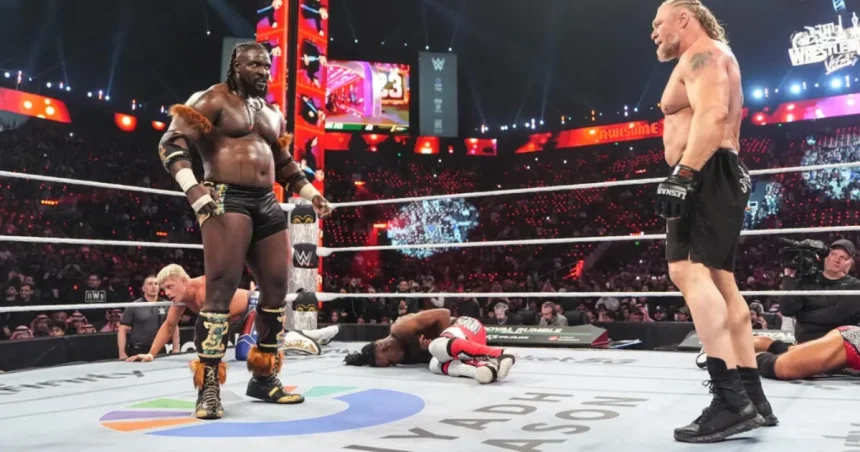 Femi s’est ensuite tenu au-dessus de Lesnar en pointant vers le panneau de WrestleMania, créant un moment mémorable qui a fait parler les fans.